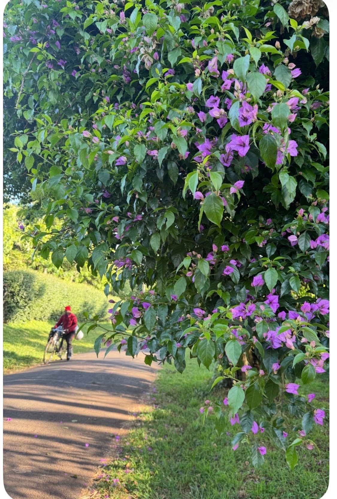 I see lots of interesting things on my walks. This morning I was able to get a shot of this beautiful flowering bush/ tree. If you look in the background, you see a man with a bicycle and it’s hard to see, but he has milk cans on the back of his bicycle. I see him most days taking milk to the dairy where they make cheese the one that’s called Browns.