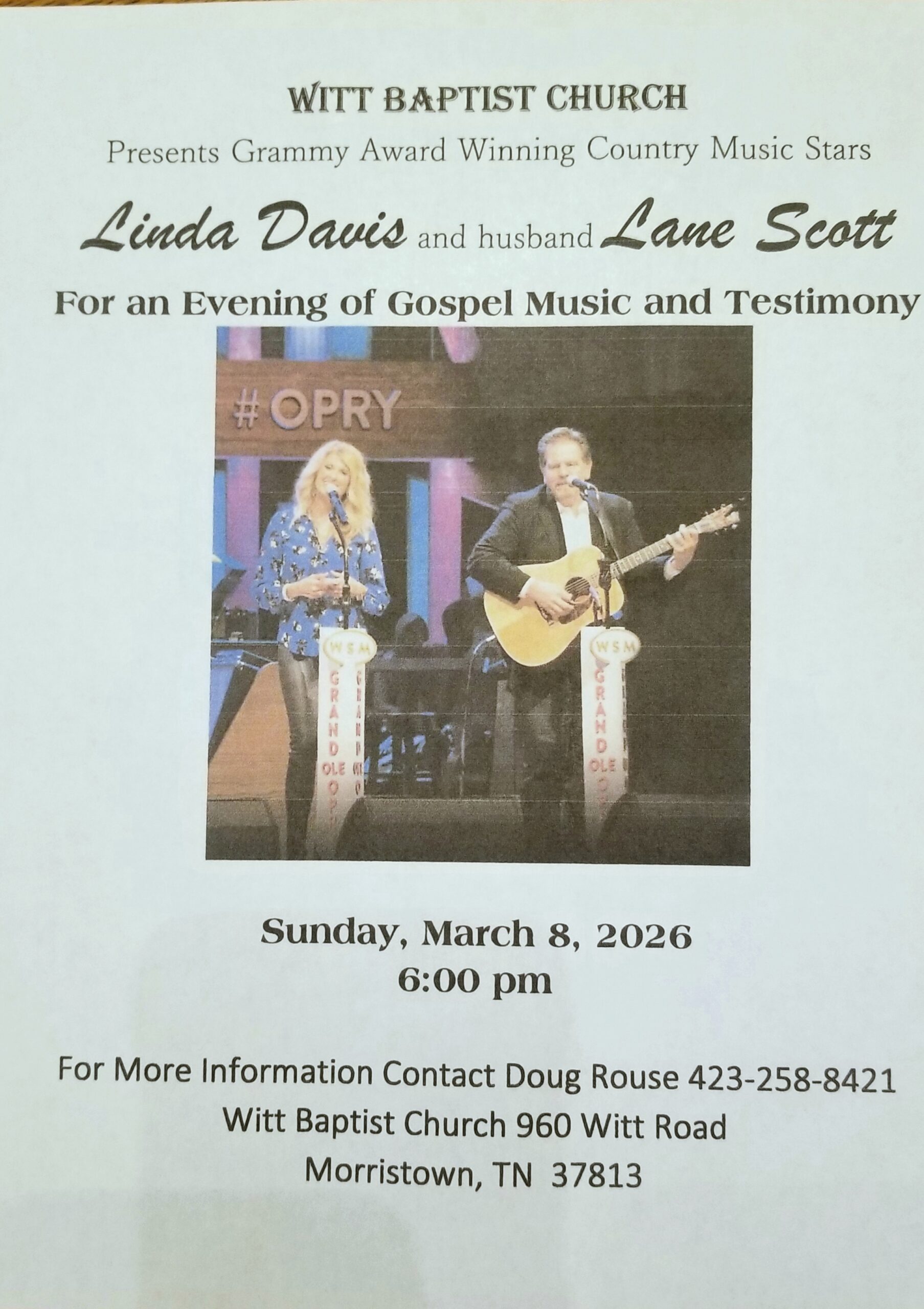 Linda Davis and Lane Scott You don’t want to miss this great concert of Grammy Award winning husband wife concert.
